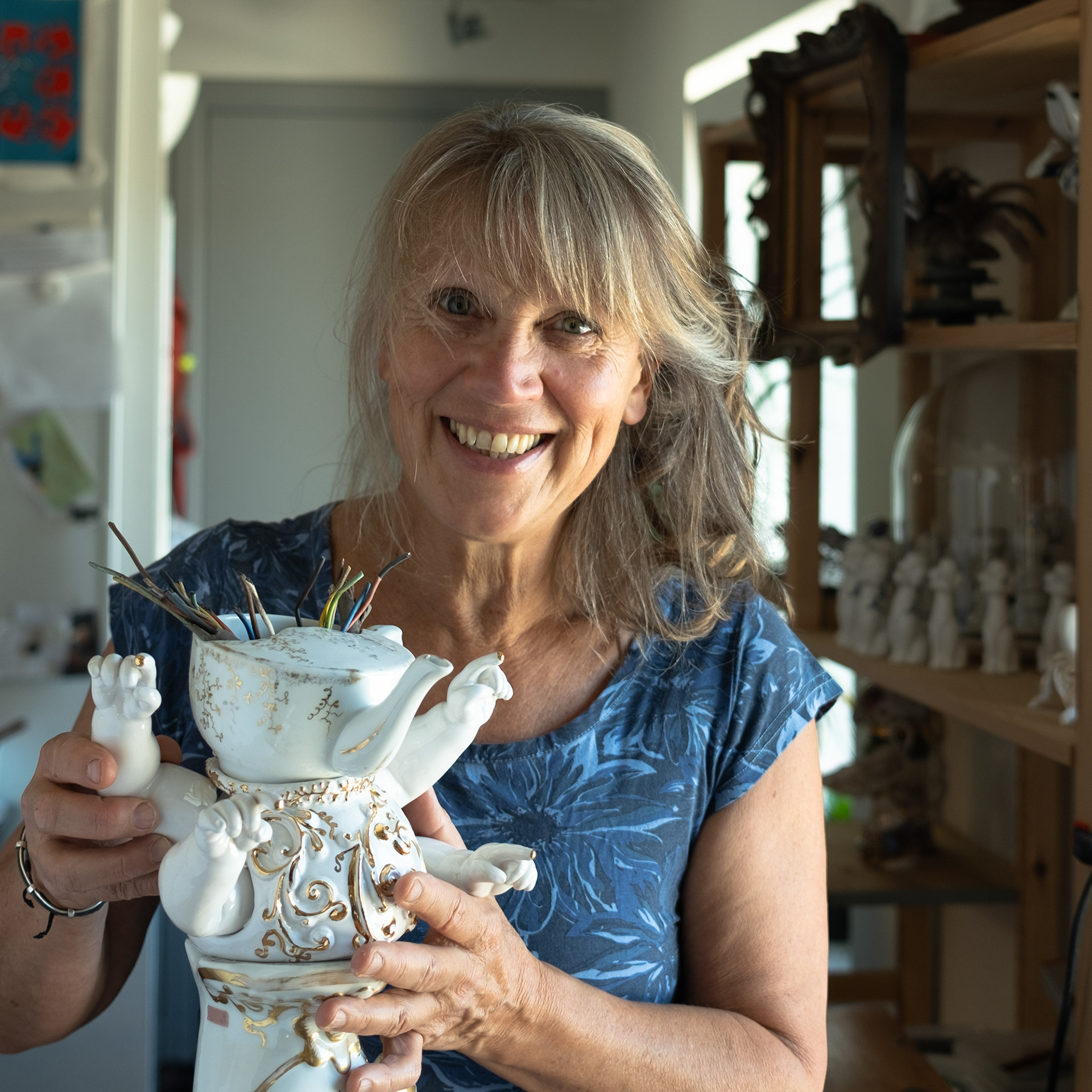 Werkt sinds 2018 in haar atelier in Hoogstraten (BE).