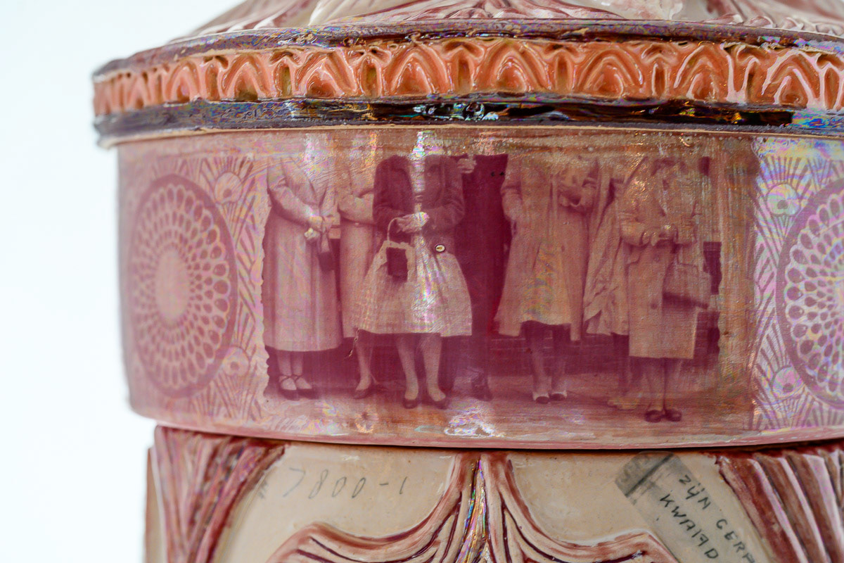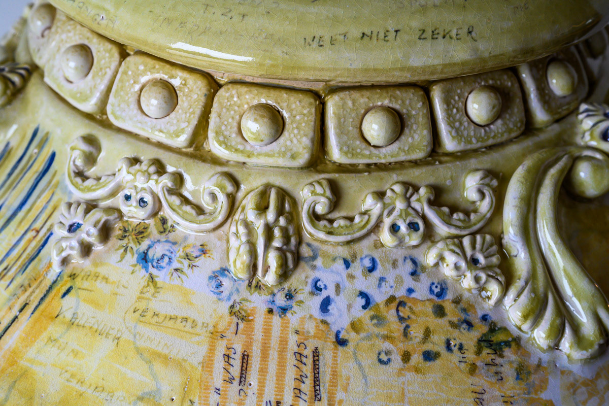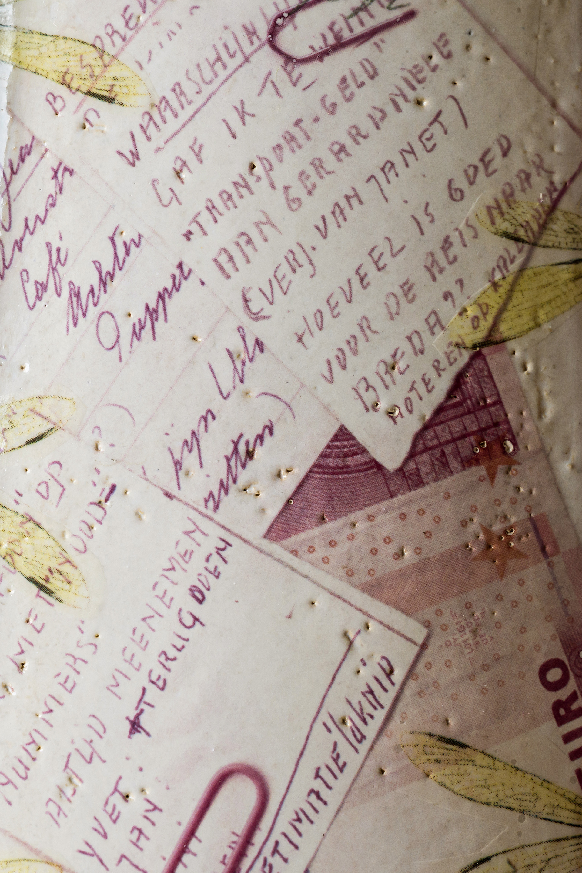 De vazen zijn drager van een concept, bekleed met decoraties en persoonlijke memobriefjes van mijn moeder.